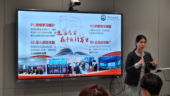 孝睿杰以自身丰富的竞赛经历为切入点,阐述了从初次参赛的探索尝试,到逐渐取得成绩,再到在各类赛事中脱颖而出的成长过程。她的亲身经历让使学生们对创新创业领域有了更为深入和全面的理解。她强调:创新不是空中楼阁,要紧扣'双碳'战略、能源转型等国家重大需求,在解决实际痛点中体现工科生的专业价值。”结合自身三年双创实践,孝睿杰提炼出“创新人才成长四维模型”,一是构建“专业课程+交叉学科”的知识体系,定期研读《Energy》《石油学报》等顶级期刊;二是深化“实验室-竞赛场-产业端”的实践链条,主动参与教师科研项目;三是培育“敢闯会创”的开拓精神,在失败案例中积累经验;四是搭建“导师-学长-队友”支持网络,发挥传帮带作用。在科技创新方面,她建议同学们要持续提升基础理论的学习,深度参与项目实践,积极投身奉献和加强交流合作。