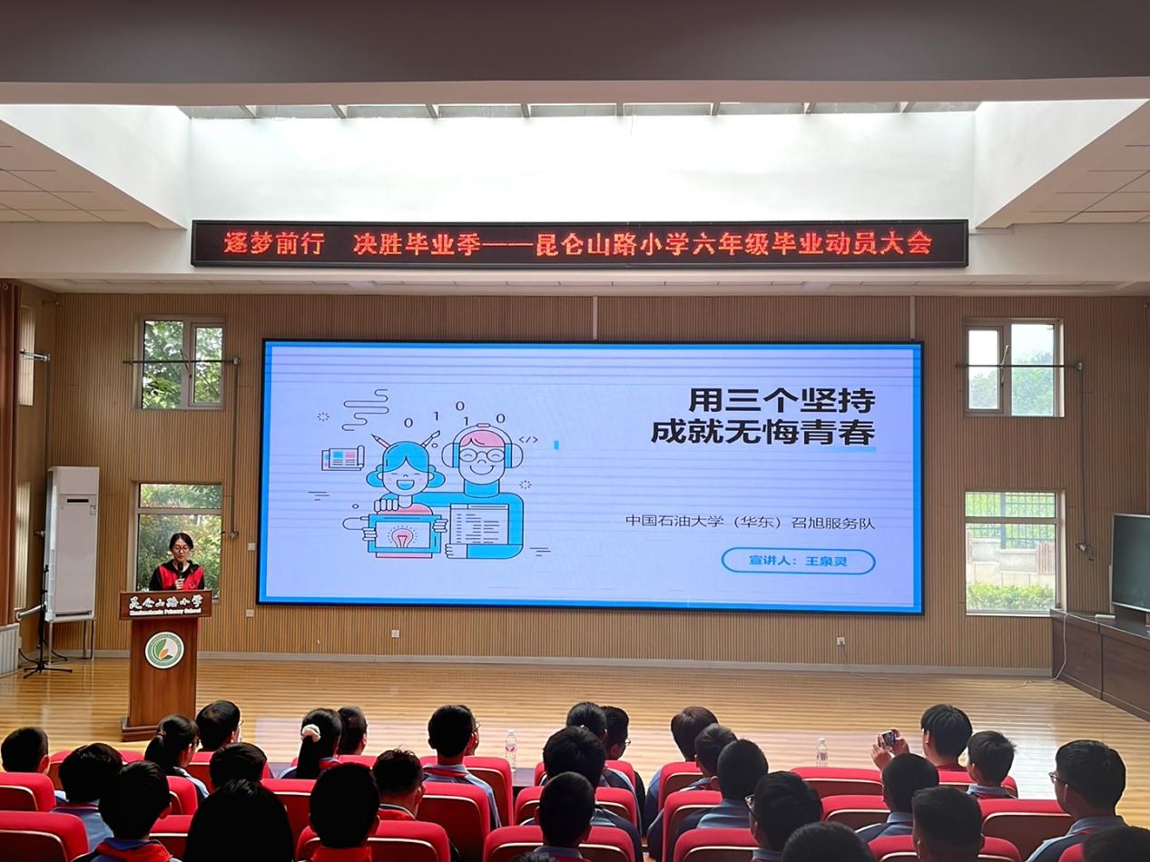 为提振学生的学习精神,巩固服务队与学校的深度合作成果,5月6日下午,召旭服务队在志愿者王泉灵的带领下,走进昆仑山路小学报告厅开展了一场精彩纷呈的学习分享会。此次活动面向近200名来自六年级的学生,学校校长、家长代表也齐聚一堂,共同见证孩子们成长路上的重要时刻。