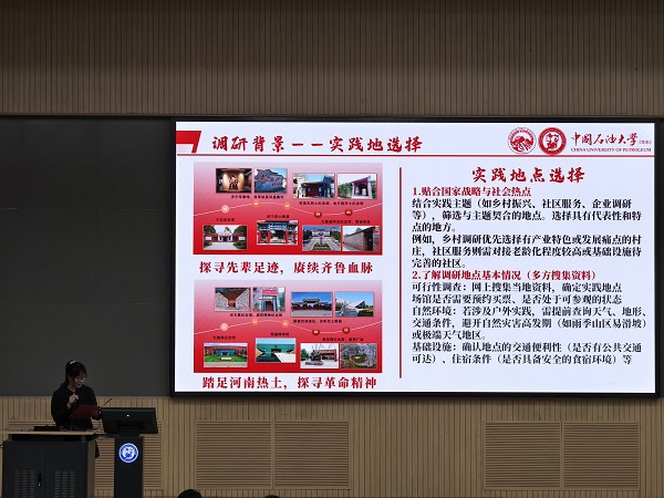 张琳苑老师以《用脚步丈量祖国大地》为题,结合自身实践经历,深入剖析社会实践的内涵与实践准备要点。她强调“用脚步感受时代脉搏,把论文写在祖国大地上”,号召学生在社会实践中践行青年责任与担当。