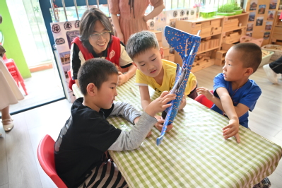 团支部成员指导幼儿完成航模 钦宇帆摄