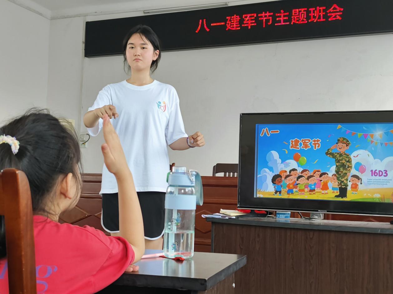 随后,支教队员与学生共同参与破冰游戏——你演我猜。学生与支教队员默契配合,尽可能为自己所在的队伍加分。通过破冰游戏中的互动成功拉近了支教队员和学生的距离。支教队员张鸿嬿为学生进行八一主题班会课的讲解。张鸿嬿带领学生观看《南昌起义》的纪录片片段,为学生讲述革命先烈的故事,回顾人民军队自建立以来的光辉历程。