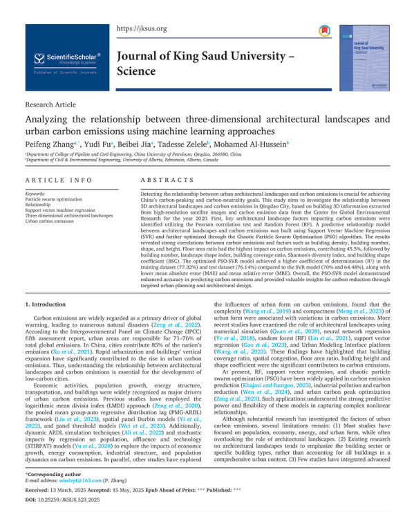 近日,建筑系高级实验师张培峰在建筑三维景观与城市碳排放的研究中取得重要进展,相关研究成果Analyzing the relationship between three-dimensional urban architectural landscapes and carbon emissions using machine learning approaches发表在《Journal of King Saud University - Science》,目前影响因子为3.6。论文第一作者和通讯作者为张培峰,第二作者为硕士研究生付煜迪与贾贝贝,第三作者为加拿大阿尔伯塔大学Tadesse Zelele和Mohamed Al-Hussein教授。ok138cn太阳集团第一通讯单位,该研究得到国家留学基金委项目、青岛市科技局项目、山东省自然科学基金的资助。