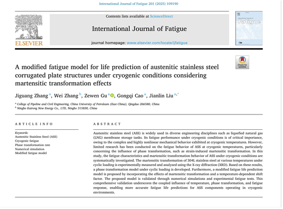 近日,我院刘建林教授团队在能源工程与力学交叉领域中LNG薄膜储罐关键构件材料的本构关系及疲劳性能预测模型等研究方面取得新进展,相关研究成果《The modified Swift constitutive model of 304L stainless steel at the cryogenic temperature based on the Olson–Cohen model》发表在《Engineering Fracture Mechanics》,《A modified fatigue model for life prediction of austenitic stainless steel corrugated plate structures under cryogenic conditions considering martensitic transformation effects》发表在《International Journal of Fatigue》。发表期刊均为力学领域顶级期刊。论文第一作者为在读博士生张继光,通讯作者为刘建林教授,ok138cn太阳集团为第一署名单位和唯一通讯单位。上述研究得到国家自然科学基金面上项目、山东省自然科学基金面上项目等资助。