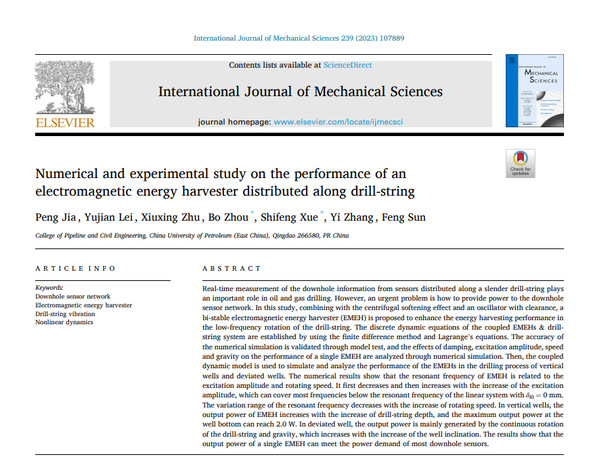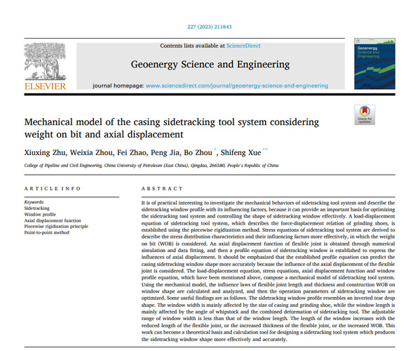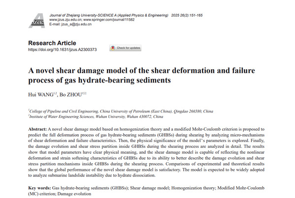 近期,我院周博教授团队在石油与地质工程领域的力学理论与数值方法等方面取得新进展。相关研究成果以“MSDM-MHBS: A novel multi-scale damage constitutive model for methane hydrate-bearing sediments considering the influence of fine”发表在期刊《Computers and Geotechnics》(SCI,中科院1区);以“A semi-analytical method for the stress distribution around a borehole with multiple casings and cement sheaths”和“Mechanical model of the casing sidetracking tool system considering weight on bit and axial displacement”发表在期刊《Geoenergy Science and Engineering》(SCI,中科院2区);以“Numerical and experimental study on the performance of an electromagnetic energy harvester distributed along drill-string”发表在期刊《International Journal of Mechanical Sciences》(SCI,中科院1区);以“A novel shear damage model of the shear deformation and failure process of gas hydrate-bearing sediments”发表在期刊《Journal of Zhejiang University-Science A》(SCI,中科院2区)。