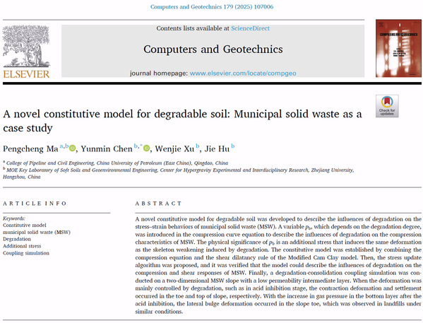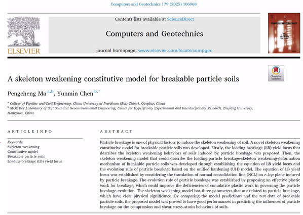 近日,我院教师马鹏程在骨架可降解土本构模型及多场耦合理论研究方面取得新进展,相关研究成果《A novel constitutive model for degradable soil: Municipal solid waste as a case study》和《A skeleton weakening constitutive model for breakable particle soils》发表在《Computers and Geotechnics》。《Computers and Geotechnics》是岩土工程领域国际顶级期刊(SCI一区Top,影响因子6.2)。论文第一作者为马鹏程老师,通讯作者为浙江大学陈云敏院士,ok138cn太阳集团为第一署名单位。该研究得到了国家自然科学基金基础科学中心项目和青年科学基金项目的资助。