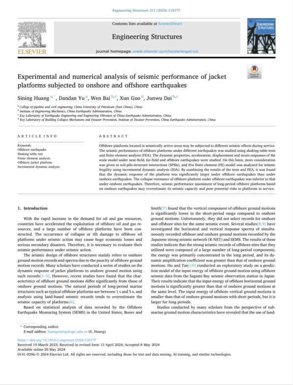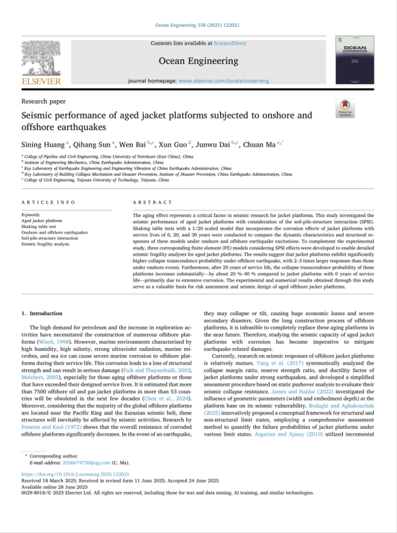 近日,我院黄思凝副教授团队在导管架平台抗震性能研究和老化导管架平台的抗震性能研究方面取得新进展,相关研究成果《Experimental and numerical analysis of seismic performance of jacket platforms subjected to onshore and offshore earthquakes》和《Seismic performance of aged jacket platforms subjected to onshore and offshore earthquakes》分别发表在《Engineering Structures》和《Ocean engineering》。《Engineering Structures》是土木工程领域国际顶级期刊(SCI一区top),《Ocean engineering》是海洋工程领域国际顶级期刊(SCI二区top)。论文第一作者为黄思凝老师,ok138cn太阳集团为第一署名单位。该研究得到了国家自然科学基金面上项目:基于全结构全要素的结构地震致灾机理研究和国家重点研发计划项目的资助。