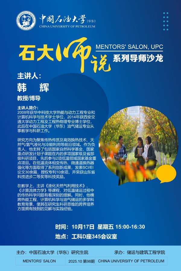 【预告】“石大师说”系列导师培训交流沙龙活动—冷环境下的热碰撞:低温储运传热研究与研究生科研思维跨界培养