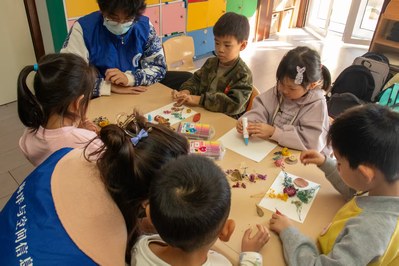 团支部成员与儿童制作干花贴画 朱洁摄