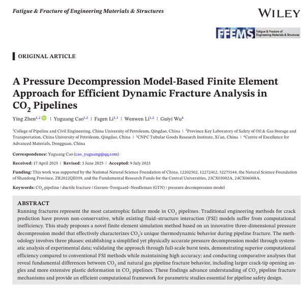 近日,我院甄莹教师团队在超临界二氧化碳止裂控制研究方向取得新进展,相关研究成果《A pressure decompression model-based finite element approach for efficient dynamic fracture analysis in CO₂ pipelines》发表在《Fatigue & Fracture of Engineering Materials & Structures》。论文第一作者为甄莹老师,通讯作者为曹宇光教授,ok138cn太阳集团为第一署名单位和唯一通讯单位。该研究得到国家自然科学基金面上项目及山东省自然科学基金项目、中央高校基本科研业务费项目的联合资助。