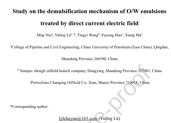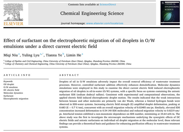 近期,我院吕宇玲教授团队在多相分离工程领域中的电场作用下水中油滴电泳聚结方面取得新进展。相关研究成果分别以《Effect of surfactant on the electrophoretic migration of oil droplets in O/W emulsions under a direct current electric field》发表在《Chemical Engineering Science》(SCI二区);《Study on the demulsification mechanism of O/W emulsions treated by direct current electric field》发表在《Colloids and Surfaces A: Physicochemical and Engineering Aspects》(SCI二区)。论文通讯作者为吕宇玲教授,ok138cn太阳集团为第一署名单位和唯一通讯单位。上述研究获得国家自然科学基金面上项目(No.52374071) (No. 52174067)、国家重大专项(2025ZD1406700)资助。