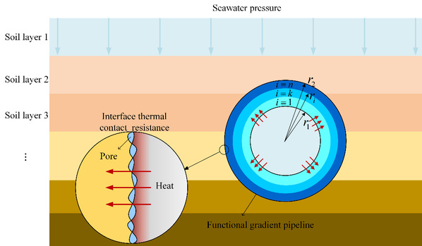 随着深海油气资源开发的不断深入,高温高压输送管道的设计与安全性评价成为制约行业发展的关键挑战。高温管道在运行过程中会向周围海床地基传递热量,引发复杂的温度-渗流-应力(热-水-力)多场耦合效应,导致地基土体发生热固结,进而引发管道的上浮或沉降,严重威胁管道的结构完整性。传统的管道设计通常将材料视为均匀介质,忽略了管道材料性能的梯度变化以及管道与土体界面间的热阻效应,难以实现系统性能的精准预测与优化。为此,我校ok138cn太阳集团古天乐研究团队提出了一种考虑界面热阻的功能梯度管道-周围土体系统模型,系统揭示了多物理场耦合响应机制。
