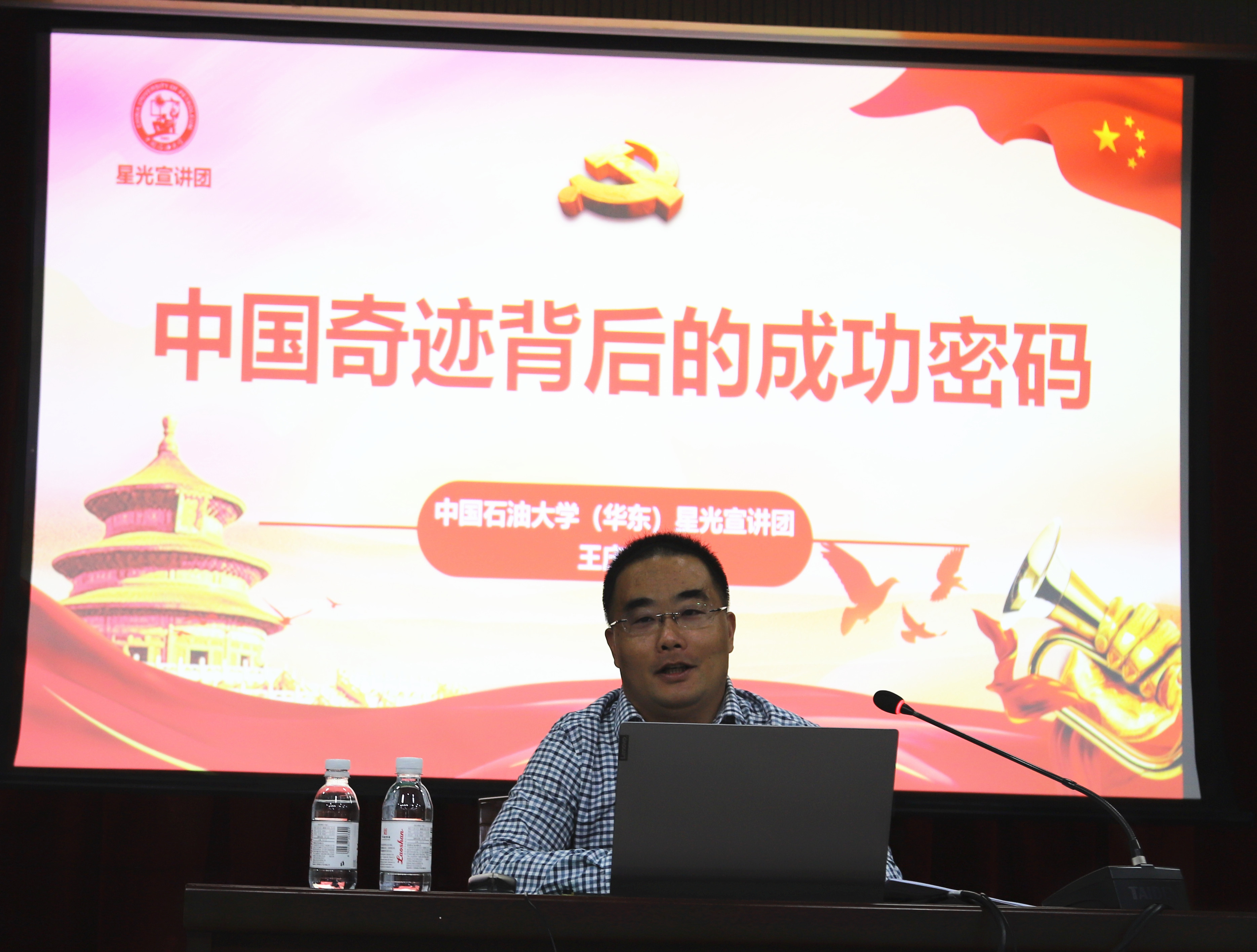 王庆忠从中国奇迹的具体表现和中国奇迹背后的密码两个方面作了一场精彩的报告。他首先详细阐述了中国奇迹的具体表现,新中国成立70年来,我们党领导人民创造了世所罕见的经济快速发展奇迹和社会长期稳定奇迹,具体表现为经济水平快速提升、政治民主日臻完善、文化发展繁荣兴盛、社会和谐稳定、生态治理成效显著等五个方面。随后,他深入解析了创造这些奇迹的原因,就是由于始终坚持了中国共产党的领导、不断实现党的指导思想与时俱进、充分发挥中国制度优势、持续推进改革开放、弘扬培育民族精神、积极争取和平稳定的国际环境。最后,他指出,中国各项奇迹的创造离不开伟大的中国共产党的领导。中国的成功本质上是中国共产党的成功,是中国特色社会主义的成功,是中国特色社会主义道路、理论、制度、文化的成功。